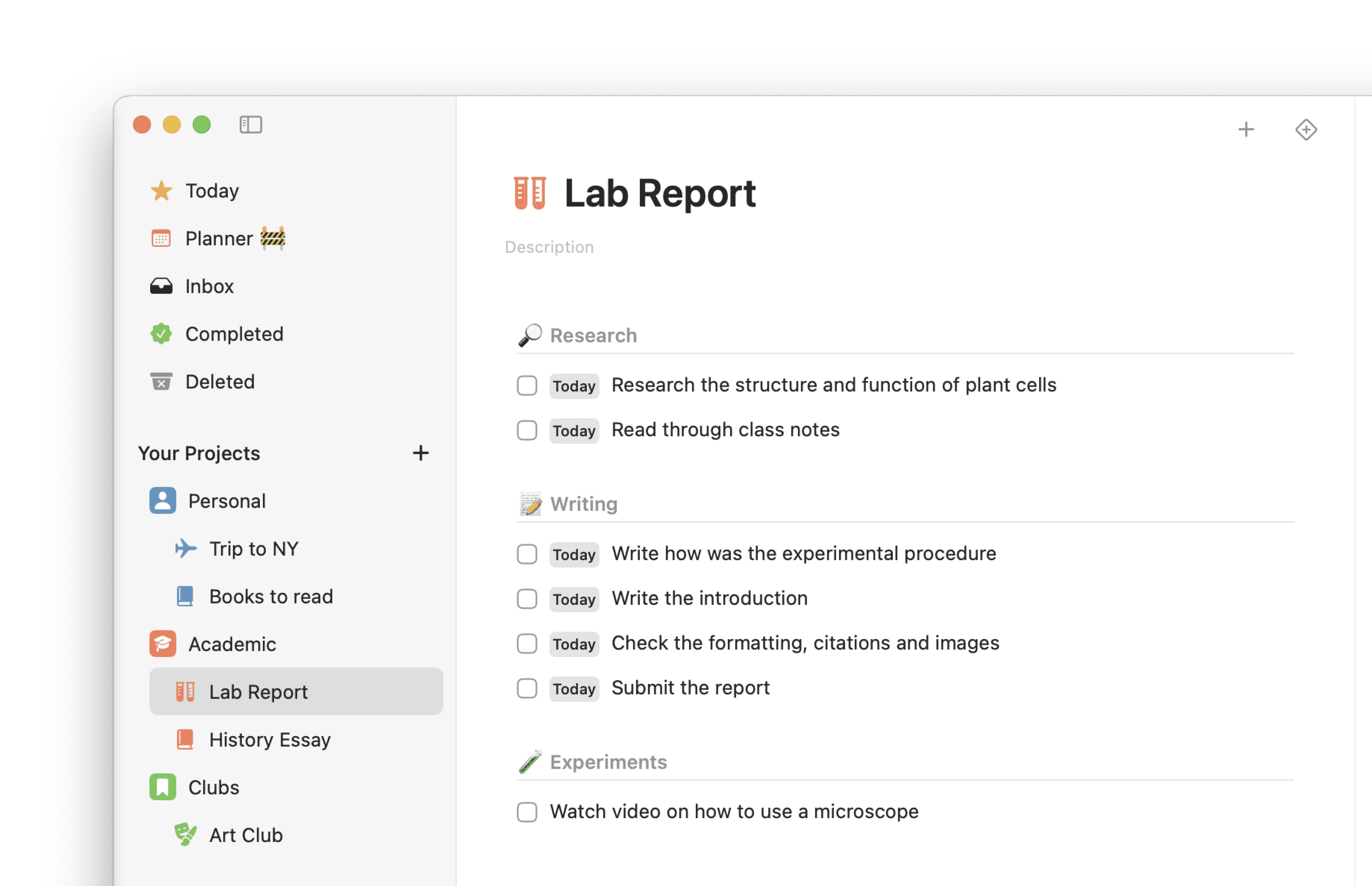 Create tasks and organize them into projects. Whether it's a homework, group project, or exam, everything is neatly categorized, so you know exactly what needs to be done, and when.